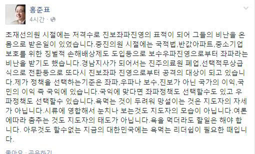 홍 지사는 31일 자신의 페이스북에 "진주의료원 폐업, 선택적 무상급식으로 전환 등으로 또 다시 진보좌파 진영으로부터 공격의 대상이 되고 있다"며 "제가 정책을 선택하는기준은 좌파, 우파나 보수, 진보가 아닌 국가의 이익, 국민의 이익 즉 국익에 있다"고 말했다.