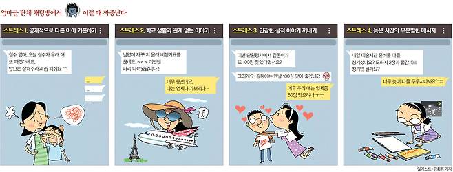 ◆스트레스 덜 받으려면=자녀가 올해 초등학교에 입학한 오모(38·서울 마포구)씨는 "백화점에 가서 냄비 사진을 몽땅 올린 뒤 어느 게 좋으냐고 묻는 등 단체채팅방에 학교 생활과 관련 없는 내용을 올리는 엄마들이 있다. 또 너무 늦은 시간에 알림음이 울리면 공해가 되기 때문에 몇 시부터 몇 시까지 글을 올릴지 엄마들끼리 정하고 사생활 정보는 자제하는 등 에티켓 룰을 정해 보는 게 좋다"고 조언했다.