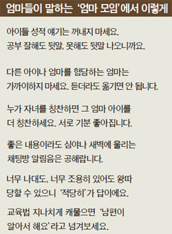 모임에도 일정 선을 유지하는 게 필요하다는 의견도 있다. 전모(43·서울 동작구)씨는 "엄마들끼리 모일 땐 적절한 선을 유지하는 게 관건이다. 또 아이가 학교 생활을 잘 하면 굳이 모임에 낄 필요가 없다는 엄마들도 많다"고 전했다.