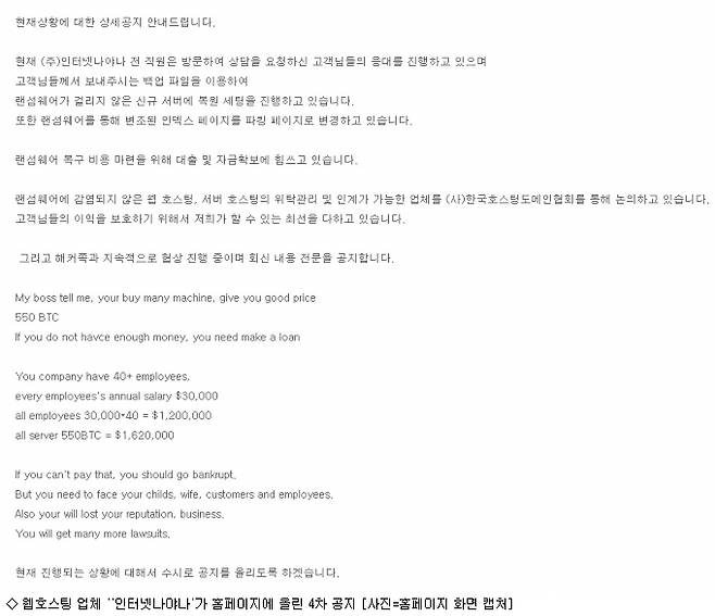 [아이뉴스24 성지은기자] 지난 10일 랜섬웨어에 감염된 웹호스팅 업체 '인터넷나야나'가 데이터 복구를 위해 해커와 협상에 나섰다.